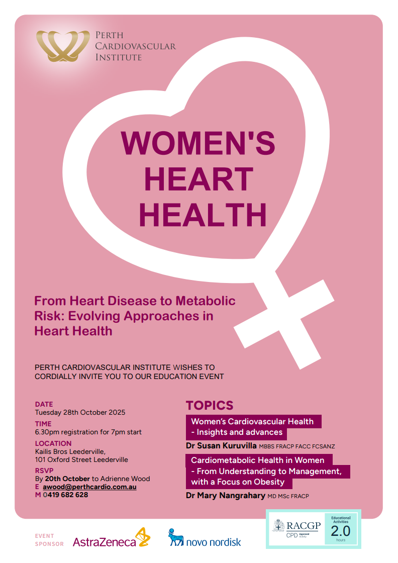 Perth Cardiovascular Institute is committed to supporting GP’s in providing outstanding patient care with an ethical, thoughtful and sustainable approach at all times. Our approach is centred in building relationships with our referring doctors. As part of this approach to excellence in health outcomes, we are delighted to present our “Heart to Heart” educational series. These sessions are focused on interactive, practical and case based presentations of core concepts in Cardiology.